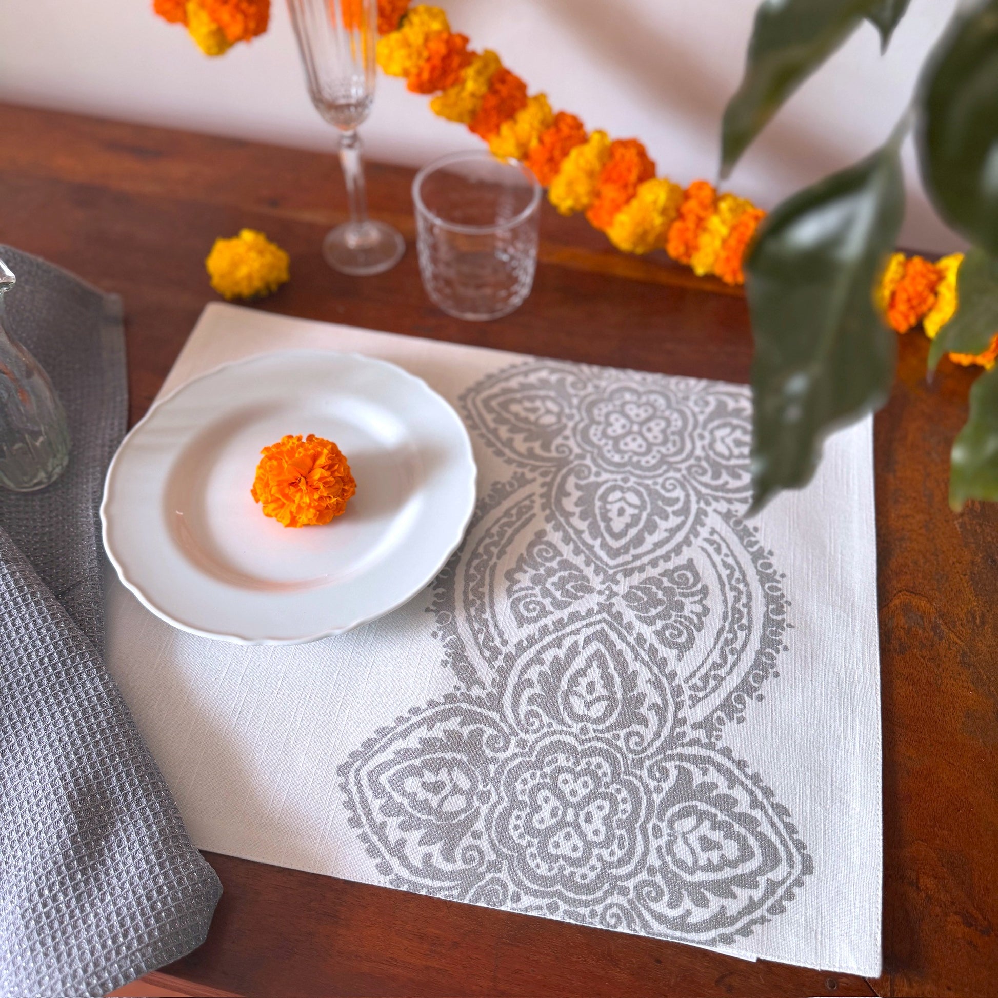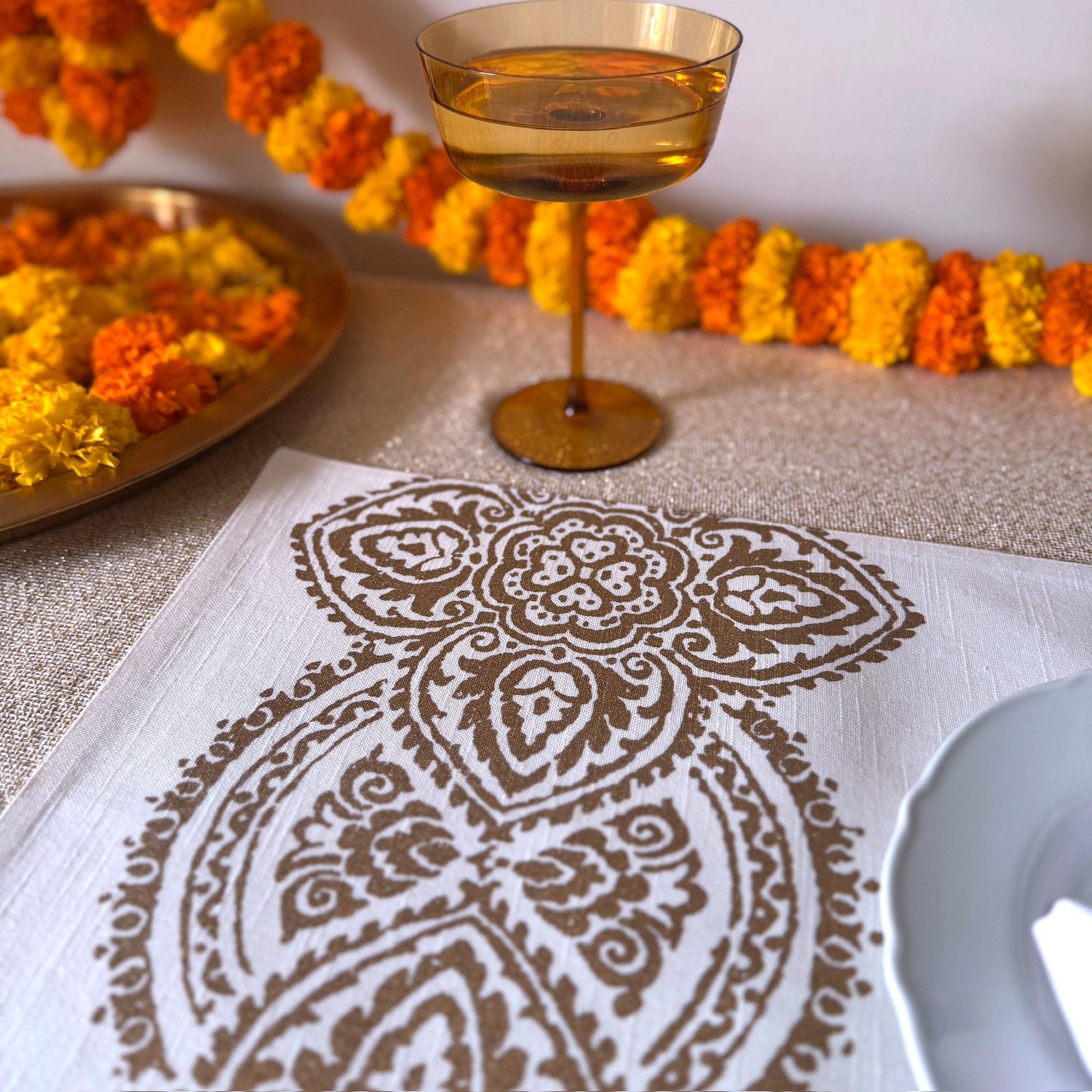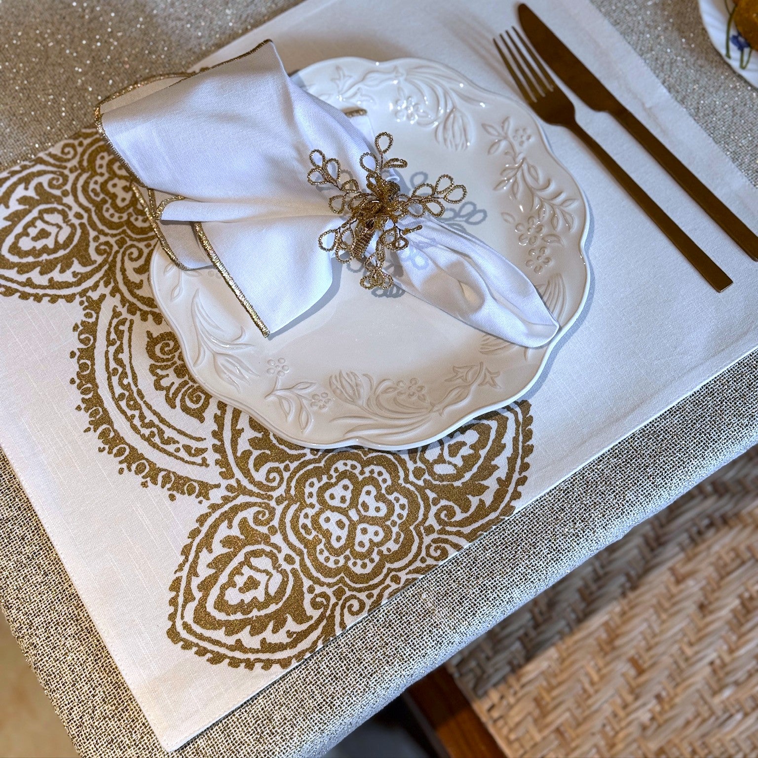For a Festive Feast: Pair the Sand Gold or White Gold placemats with traditional brass cutlery, vibrant marigold garlands, and flickering candles to create a memorable Diwali or festive setting.