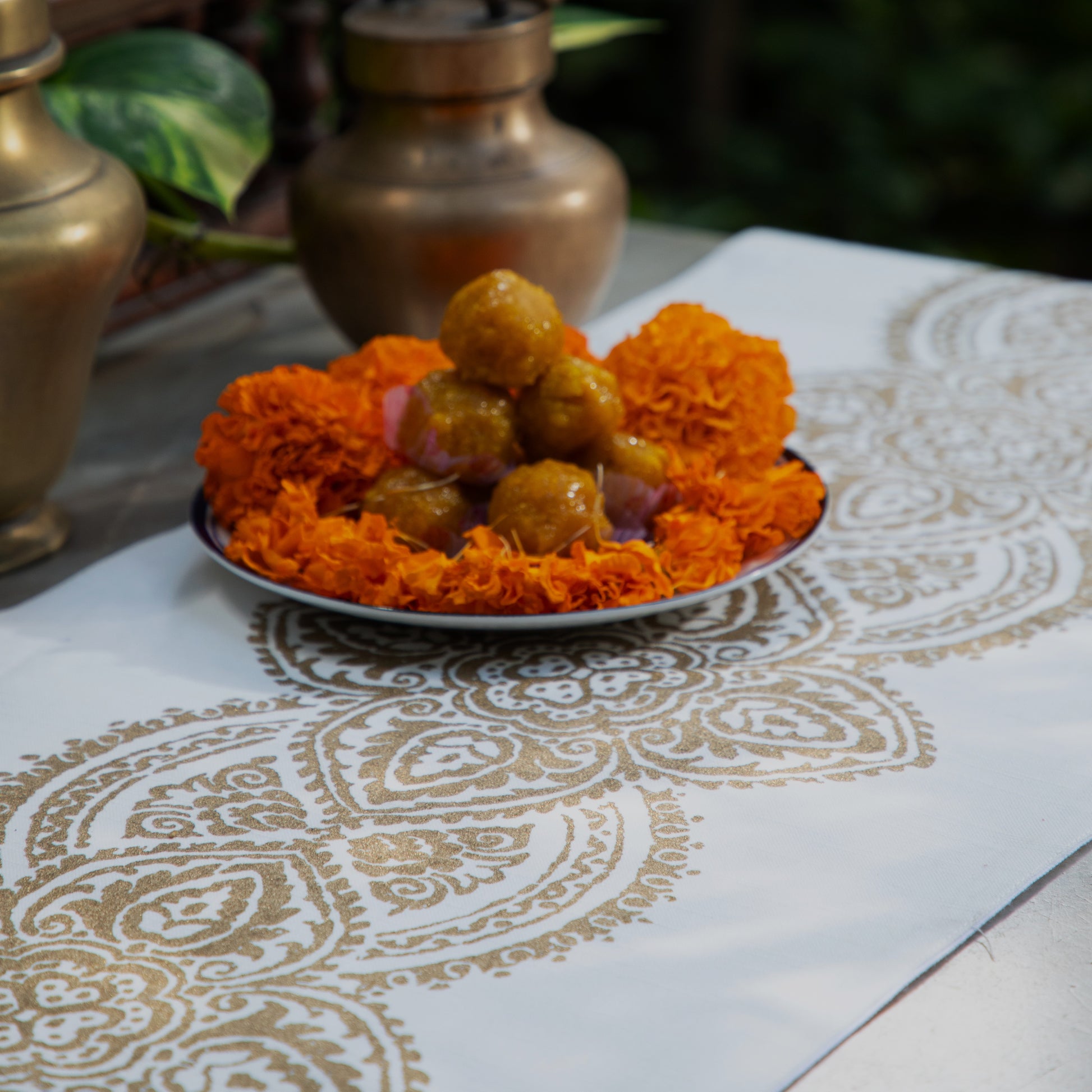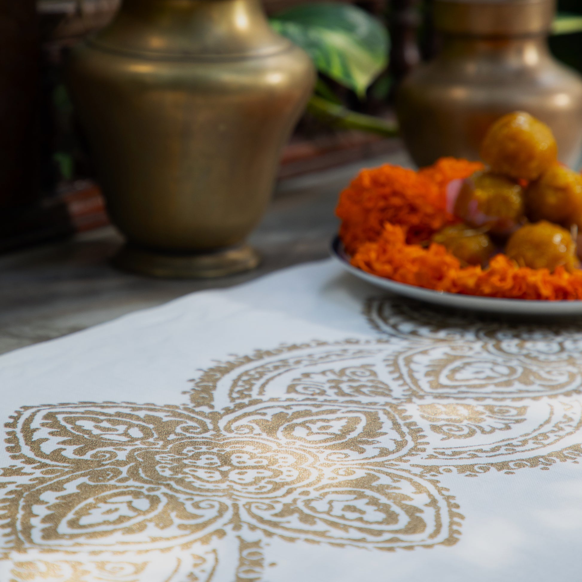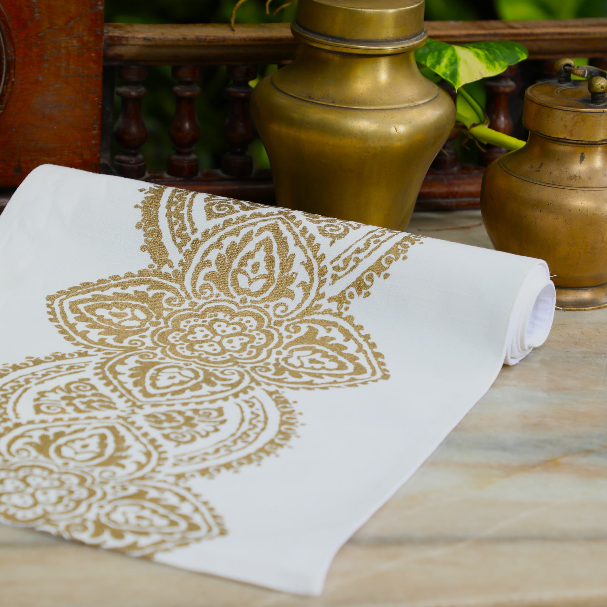 Make every meal feel like a celebration with our Athena White Gold Table Runner, a stunning piece from our festive collection. This runner features a beautiful, intricate gold foil print that shimmers down the center, creating an elegant focal point for your table. Crafted from 100% premium cotton, it offers a soft drape and luxurious feel, perfect for adding a touch of glamour to your holiday gatherings or special dinners.