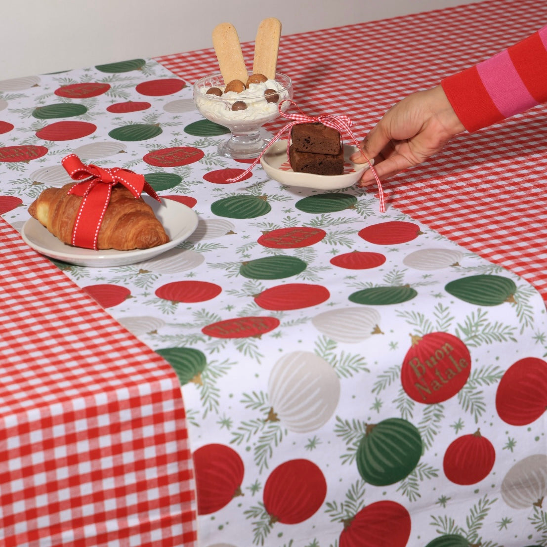 Bring the magic of Italian Christmas cheer to your table with our Buon Natale Red Runner. Featuring a charming print of festive ornaments in hues of red, green, and beige — with “Buon Natale” beautifully inscribed within the red baubles — this design captures the warmth and joy of the holidays in the most elegant way.