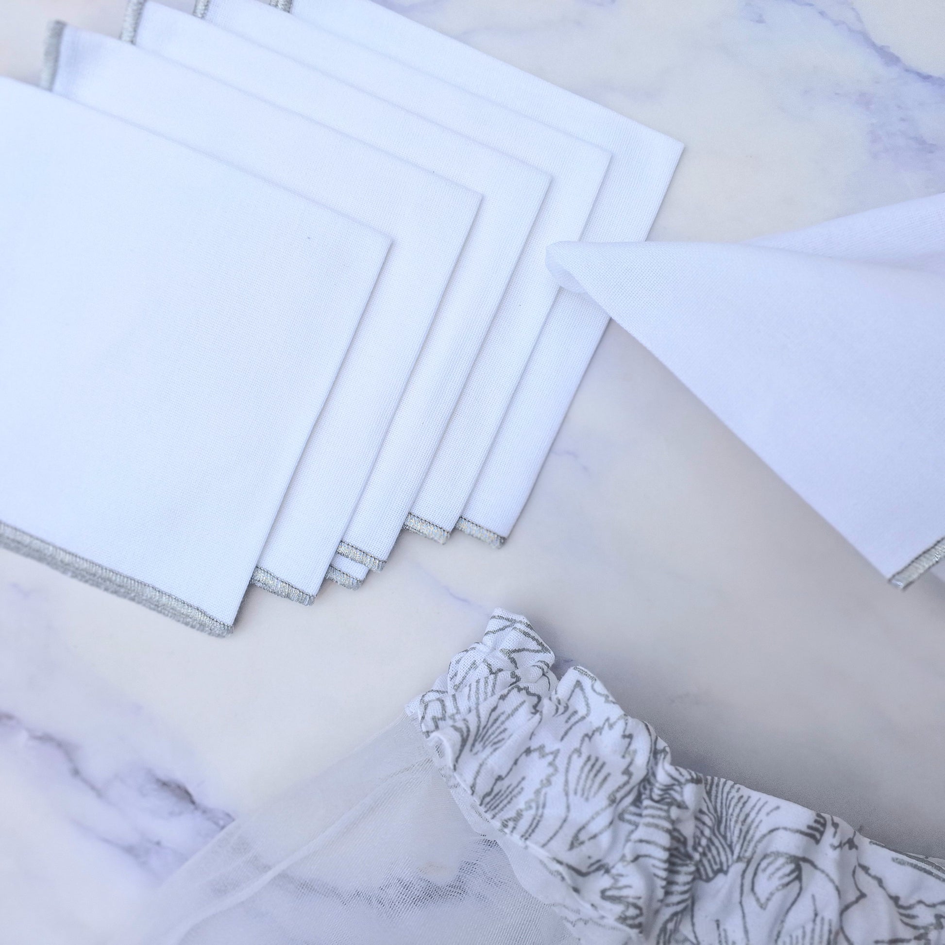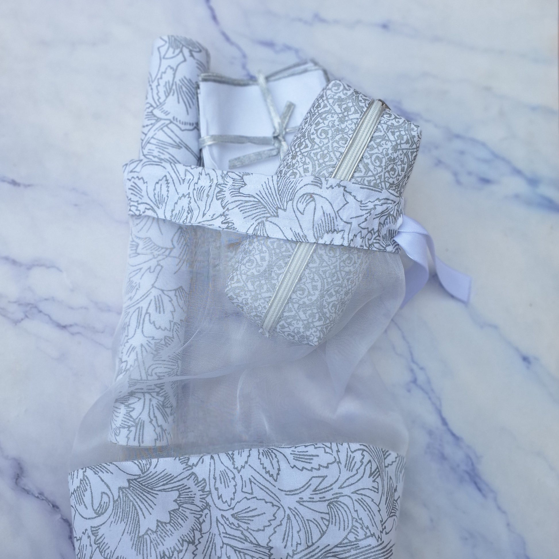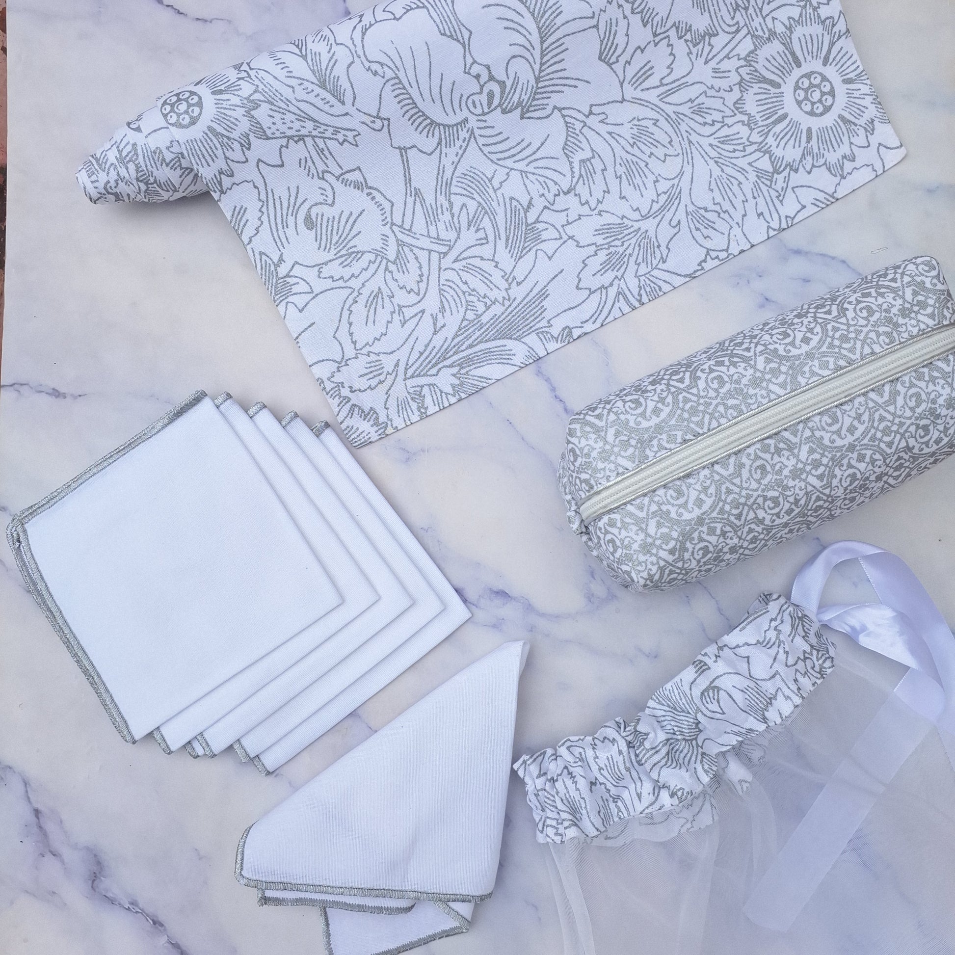 A graceful nod to everyday luxury, Fiore in Bloom - Silver is a gift set made to charm. Perfect for housewarmings, festive gatherings, or simply to say “thinking of you,” it brings quiet elegance to any table. The set features a delicately printed table runner in soft silver florals, understated yet sophisticated. Paired with six cocktail napkins, each finished with fine silver embroidery, it's the little details that make this set shine. Also included is a beautifully printed essential pouch which is practical, pretty, and perfect for travel or storage. The entire ensemble is packed in a sheer drawstring bag with floral fabric trim, making it a joy to give and receive. It’s thoughtful, functional, and beautifully coordinated. A celebration of soft hues, timeless prints, and effortless style. All in one stunning bundle.