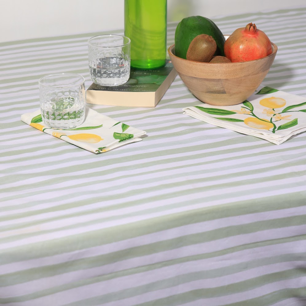 Fresh, calming, and effortlessly elegant, the Laguna Tablecloth is inspired by slow coastal living and sun-washed interiors. Featuring soft sage green and white stripes, this tablecloth brings a light, airy feel to your dining space—perfect for both everyday meals and relaxed entertaining. The gentle contrast of the stripes adds visual interest while maintaining a clean, minimal aesthetic that never feels overwhelming.