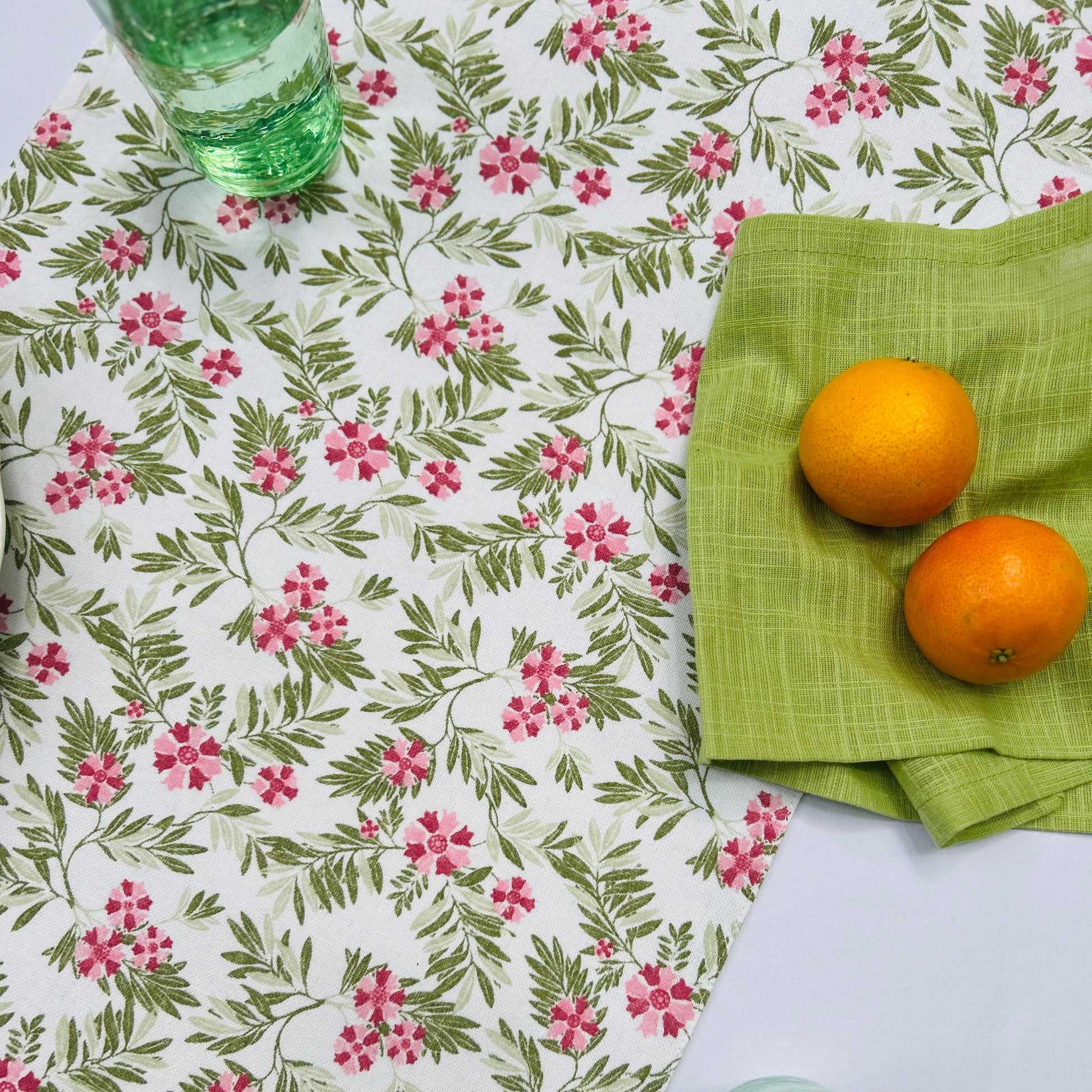 The Laura Runner brings effortless elegance to your table with its floral design in a graceful harmony of pink and green, beautifully set against a crisp white base. Crafted in premium fused cotton, it blends durability with a refined finish, making it perfect for everyday dining or festive hosting.