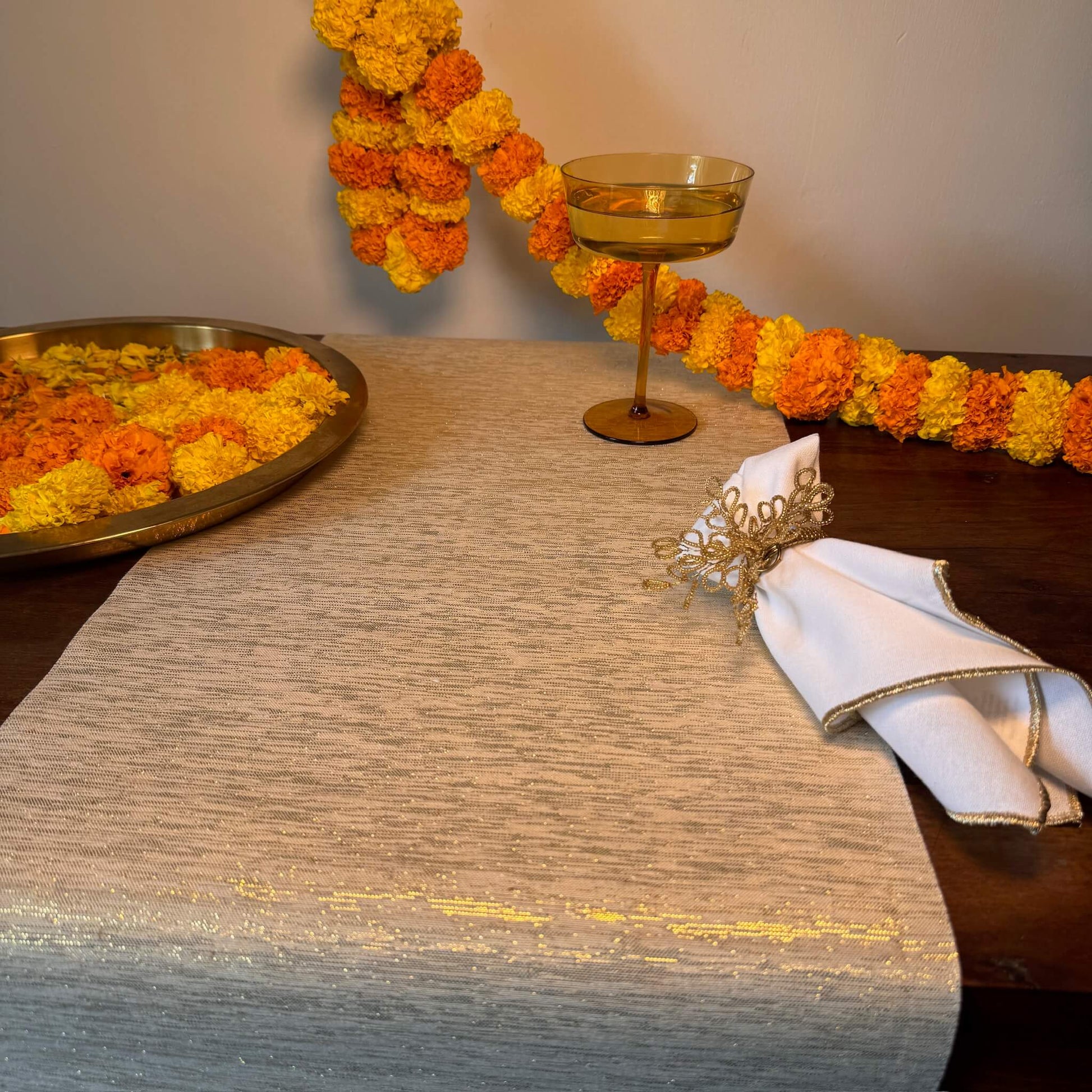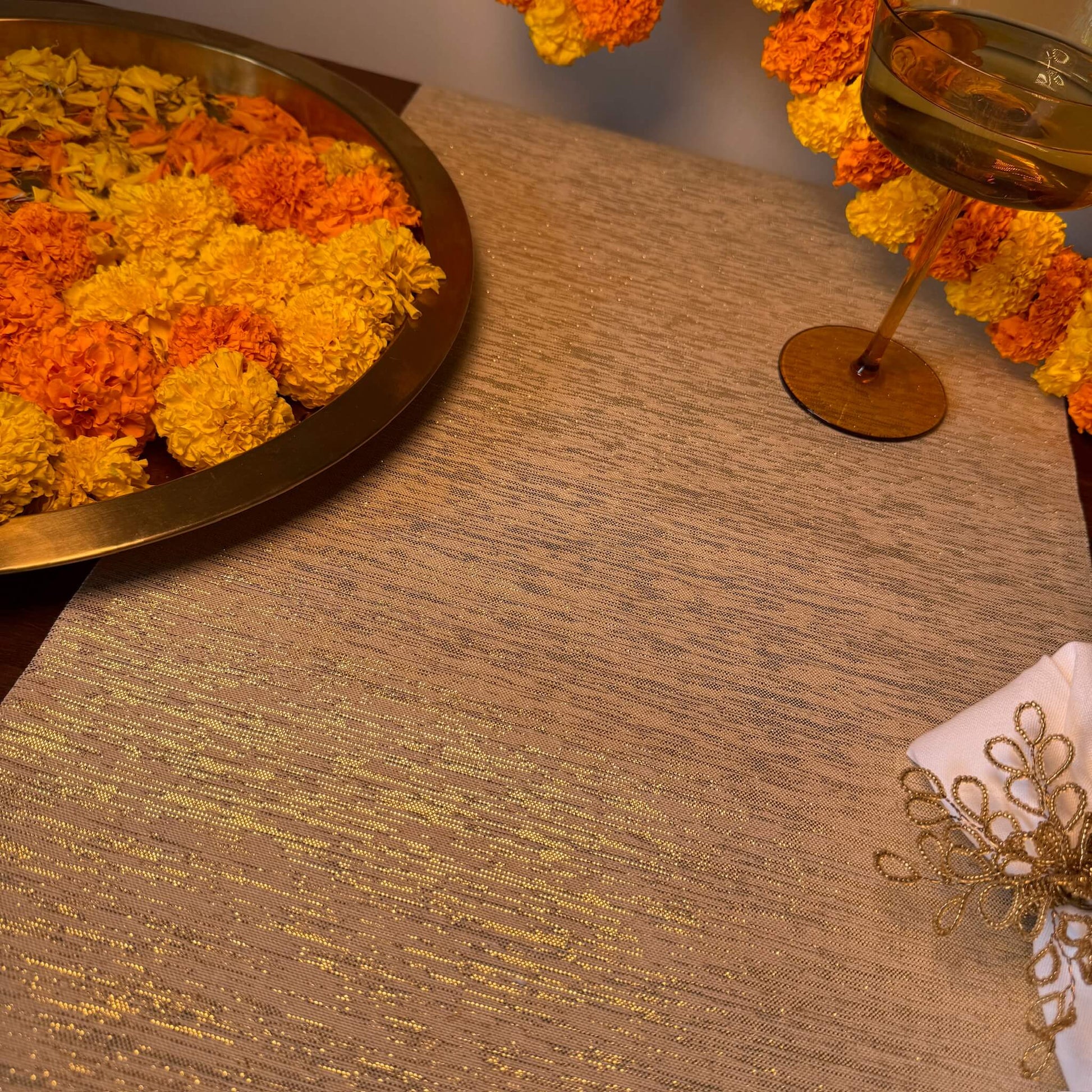 For a Grand Festive Table: Drape it down the center of your dining table and pair it with matching Lumina Placemats. Add gold-rimmed dinnerware, brass candle holders, and a few fresh flowers to create a truly magical scene.