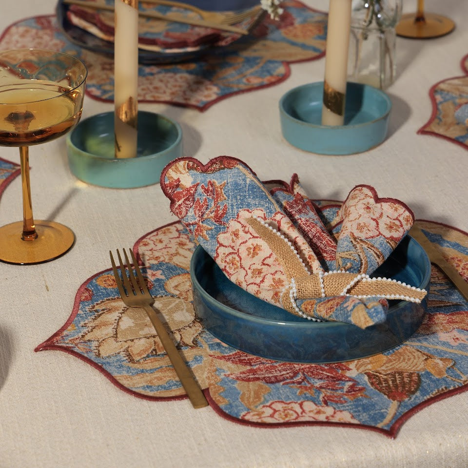 Infuse your table with the romance of faraway souks and sun-washed courtyards with our Marrakesh Placemat. Inspired by the rich visual language of Moroccan tiles and hand-painted textiles, this placemat features an intricate floral motif set against a muted blue base, accented with warm earthy hues and soft blush florals. The gently scalloped edges, finished with a contrasting border, add an artisanal touch that instantly elevates your tablescape.